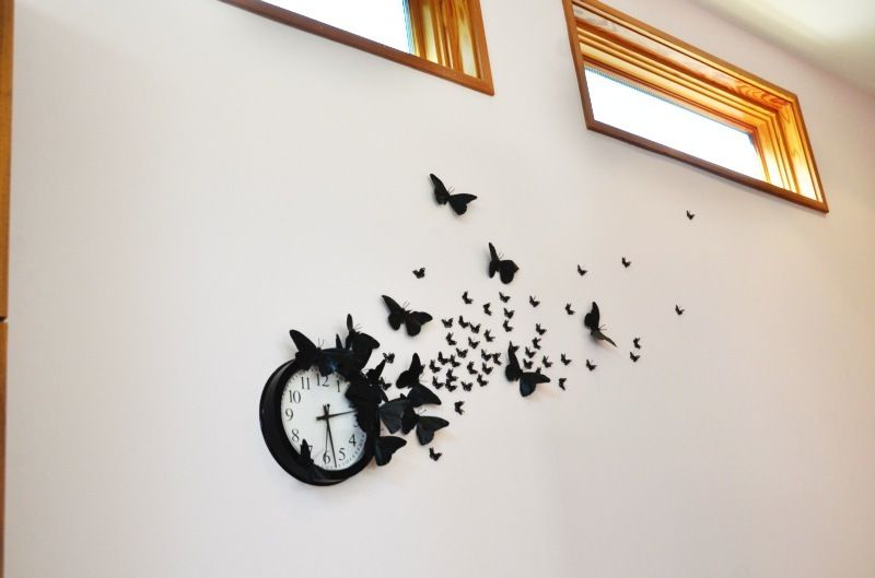 Похожим образом можно оформить стену с часами: бабочки разлетаются по стене и садятся на краешек часов.