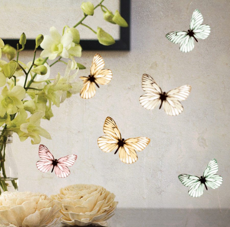 Дизайнеры предлагают использовать виниловые наклейки, представляющие собой целый рисунок. Такой набор требует больше места, но рисунок, состоящий из множества крылатых красавиц, задает тон всему помещению.