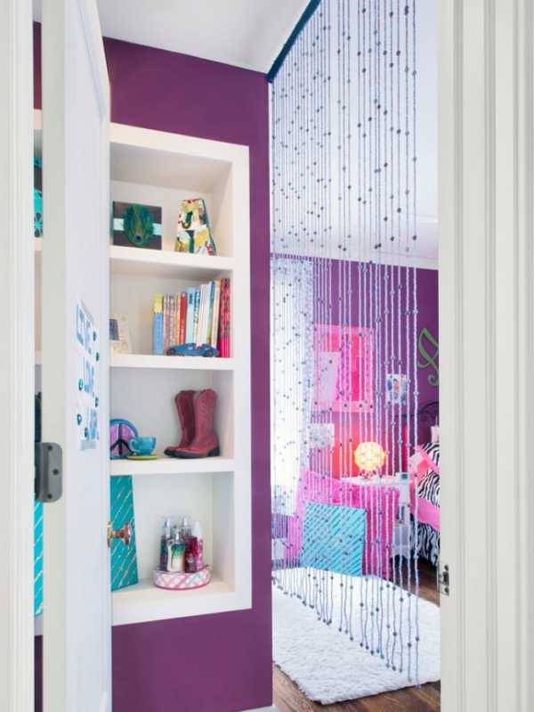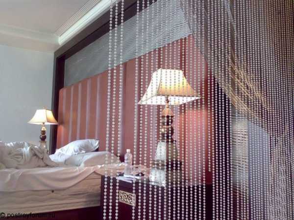 Спальне присуща романтическая, уединенная, успокаивающая атмосфера. Именно эти ощущения способны дополнить нитяные струи на окнах. Для комнаты юной леди подбирают изделия с бусинами или нежными перьями в тон отделки.