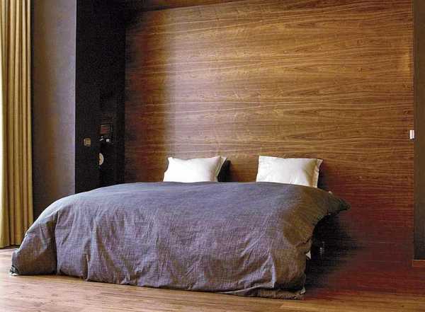В спальне на центральной стене очень эффектно будет смотреться пастельная цветовая палитра, даже с использованием неестественного для дерева голубого цвета. Она придает интерьеру нежность и легкость.