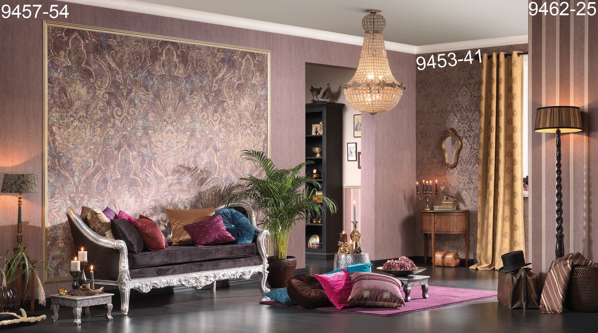 В просторной гостиной создать атмосферу наполненности и уюта помогут густые и темные обои (фиолетовые, темно-серебристые и даже черные).