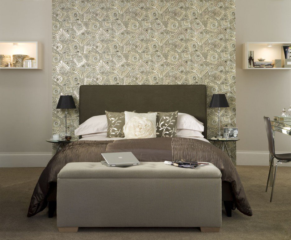 Минималистический стиль спальни помогут подчеркнуть однотонные покрытия, наделенные тисненным орнаментом. Альтернативное решение – использование «растительных» обоев лишь в качестве небольшой вставки, занимающей часть стены (или одну из четырех стен полностью).
