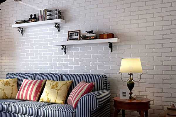 Дизайнеры советуют ограничиться центральным освещением, так как боковые источники подчеркнут искусственное происхождение кладки. Можно приобрести виниловые обои с реалистичной фактурой, благо в гостиной экологичность материалов играет не такую важную роль.
