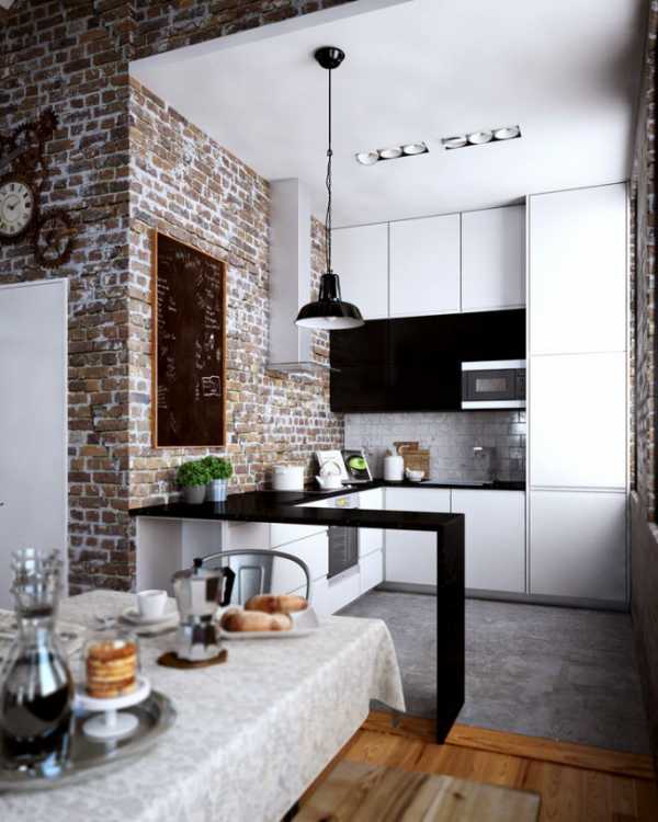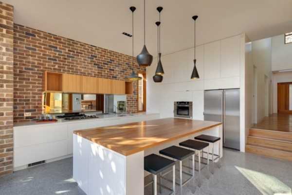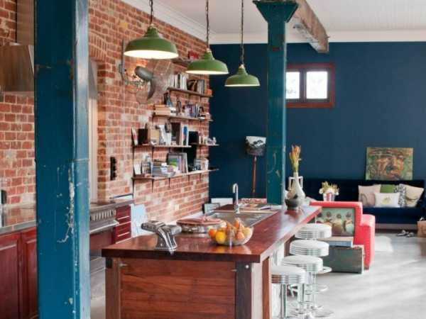 На фоне белого кирпича хорошо смотрится гарнитур из светлого дерева с яркими деталями или модели с насыщенными гаммами.На фоне красного — спокойные, холодные оттенки, которые в таком сочетании придадут помещению немного уюта.