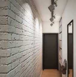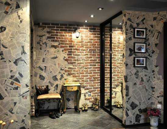 - Утилитарные пространства. Входные зоны и коридоры в типовых квартирах в редких случаях могут похвастаться большими размерами и достаточной освещённостью. Оклейка белыми обоями с кирпичным принтом иллюзорно раздвинет границы узкого пространства, а если использовать покрытия в комбинации с зеркалами, то визуальный эффект будет максимальный.