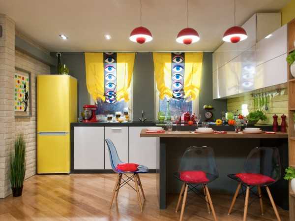 - Кухня. Здесь акцентируется внимание на фартуке. Чтобы интересно обыграть рабочую поверхность используются фактурные обои, полотна с необычным цветовым решением, сочетающим несколько созвучных или наоборот контрастных оттенков или с кирпичиками необычной формы и размера. Аналогичным образом можно выделить барную стойку или украсить столовую.