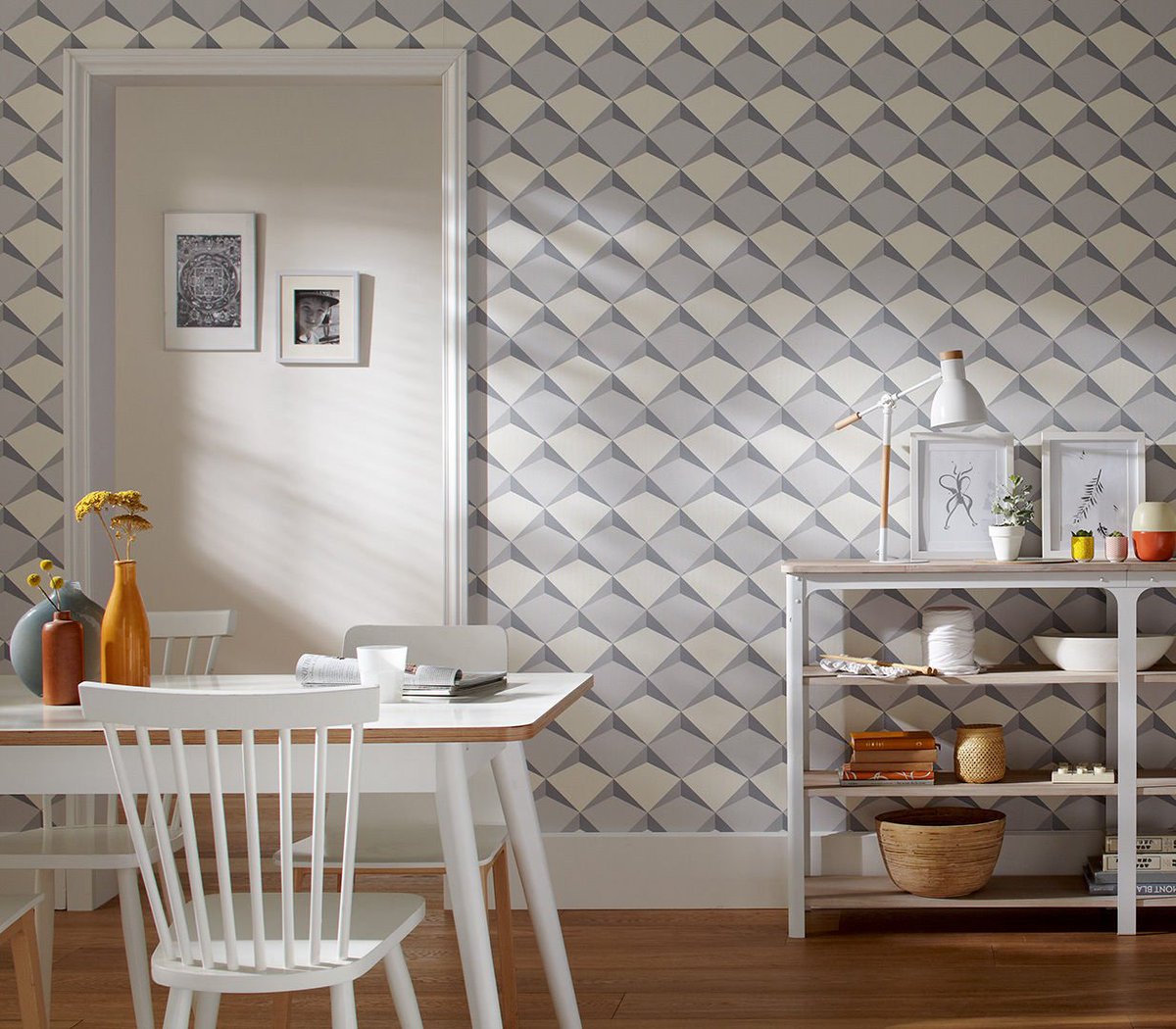 - Сочетание с деревянной мебелью в теплых тонах: Практически любой геометрический мотив выигрывает от деревянной мебели в теплых тонах.Они могут отражать формы дизайна обоев или намеренно создавать сильный контраст.