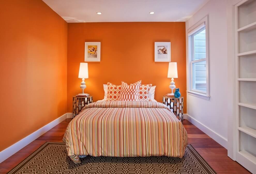 Придать индивидуальность комнате можно при помощи акцентной стены, выкрашенной в какой-нибудь яркий контрастный цвет. Почему бы не в оранжевый? Для выделения фрагмента стены подойдут также обои или отрез яркой ткани (как на фото).