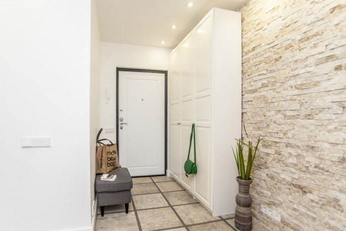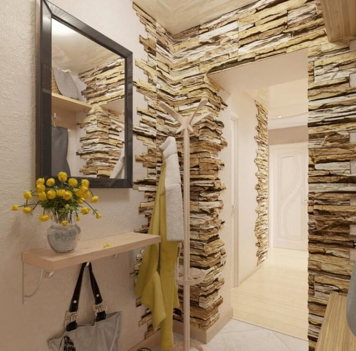 В прихожей декоративный камень придает нотки высокого статуса и роскоши. Он может присутствовать в качестве отделки одной из стен, обрамления декорированных ниш, арок, «рваного» или сплошного оформления углов и дверных проемов. Способность материала противостоять перепадам температур, промерзанию стен делает его наиболее практичным вариантом для входного холла.