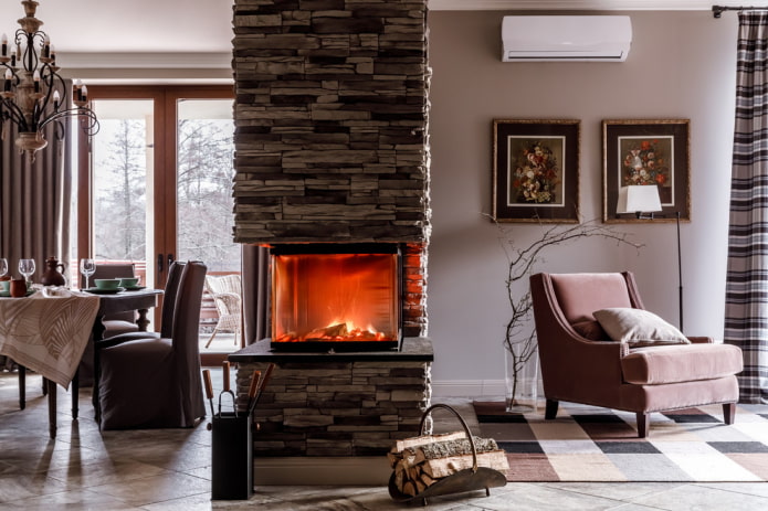 Часто используется дикий камень в интерьере квартиры. Это уникальный материал – цвет и текстура не повторяются, поэтому помещение выглядит необычно. Его применяют для отделки камина, стен, колонн.