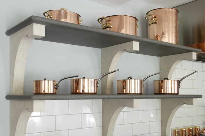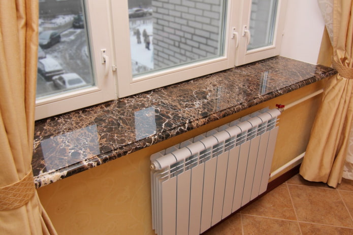 — Агломерат из кварцита, гранита и мрамора – состав получается путем дробления камней в мелкую крошку, которая затем соединяется с цементом и связующими смолами. Отдельные виды содержат красящие пигменты. В результате получается глянцевое покрытие с вкраплениями натуральных фрагментов;