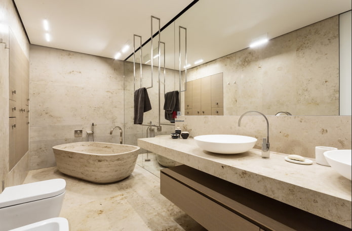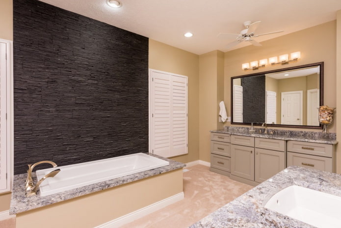 Для ванной комнаты рекомендуется подбирать варианты отделки без пористой структуры – они не впитывают пар и влагу. Хорошо подходит искусственный камень. Такое помещение выглядит уютно, стены получают дополнительную защиту, а сочетать такое покрытие можно с любым интерьером. Обработка выполняется просто, а покрытие отличается антибактериальными свойствами.