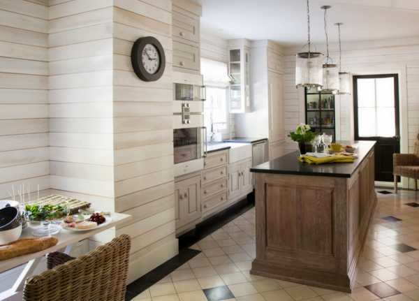 На фото реечная облицовка стен в интерьере современной кухни, которая совпадает с оформлением фартука над рабочим столом.