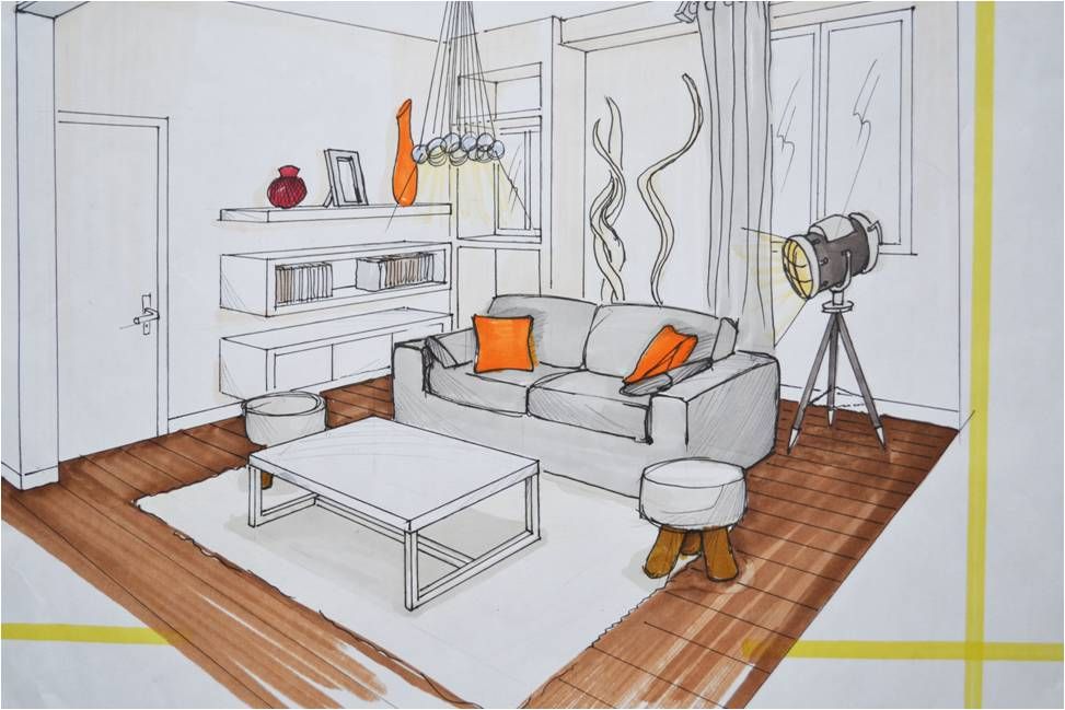 Прежде всего, успешное выполнение рисунка интерьера с натуры зависит от правильного выбора точки зрения, линии горизонта и точек схода параллельных прямых. При рисунке помещения линии горизонта будут располагаться на уровне глаз сидящего или стоящего за мольбертом человека. В зависимости от местоположения рисующего перспектива его рисунка будет угловой или фронтальной.