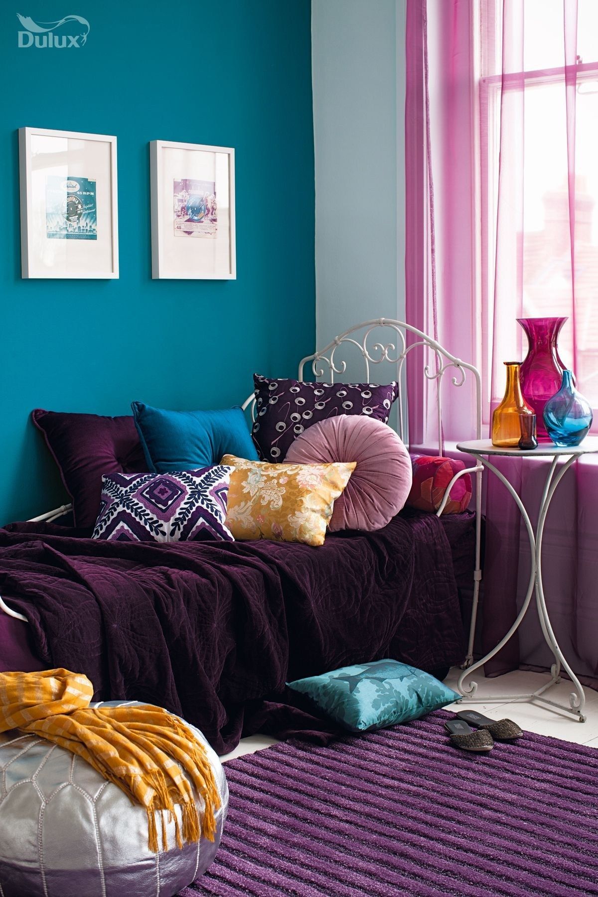 Вы открыты для смелого дизайна? Нравится, когда в интерьере что-то происходит? Сочетайте фиолетовый с бирюзой, насыщенной фуксией или изумрудно-зеленым.Хотя такое решение рекомендуется для комнат с большим количеством места.