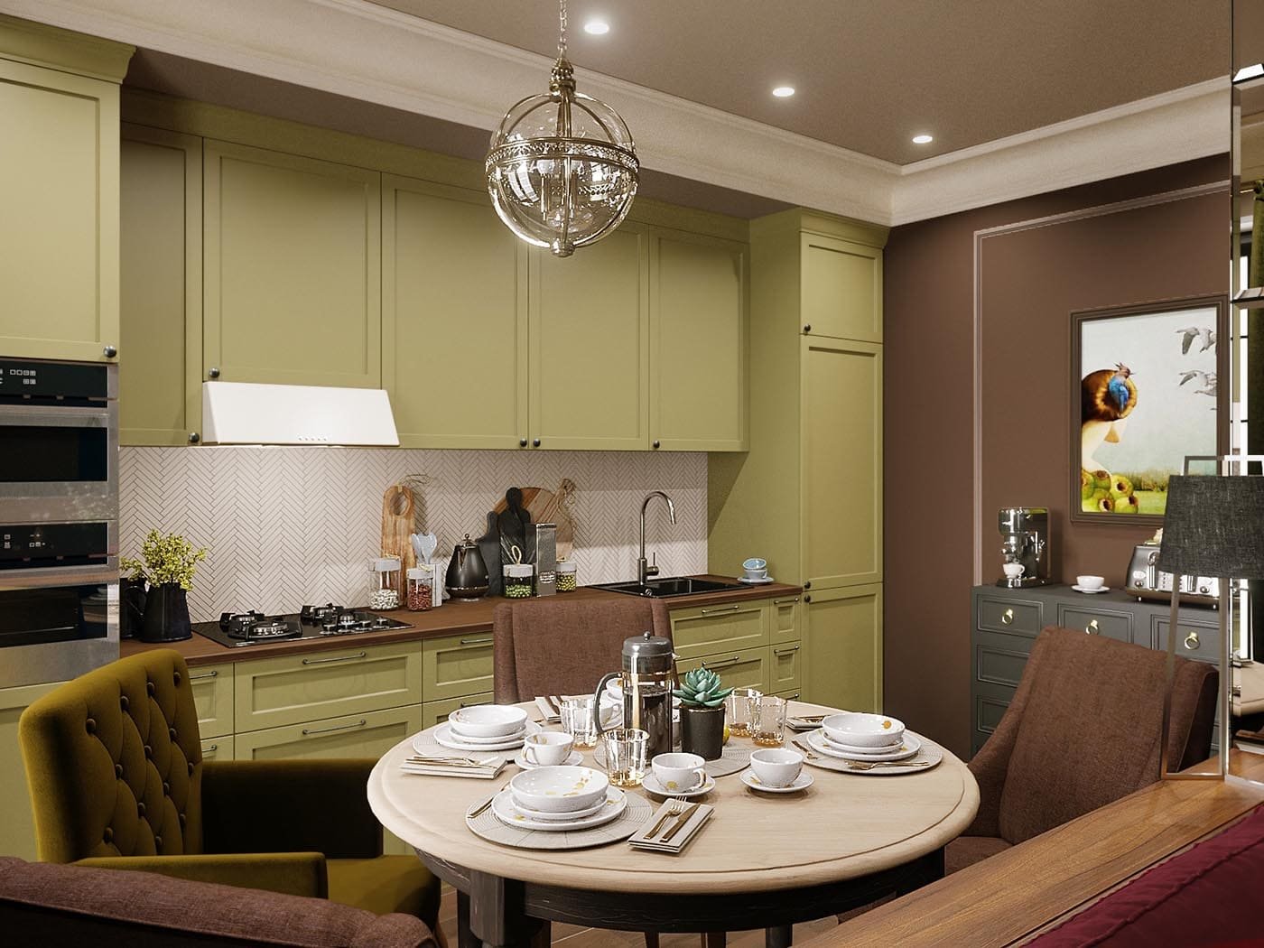 Удивительно красиво и презентабельно смотрится фисташковая мебель на кухне и в гостиной в направлении барокко и ампир. Гнутые деревянные ножки под мягкими сидениями и спинками с обивкой глубокого золотисто-оливкового оттенка – просто идеальны для дополнения таких интерьеров.