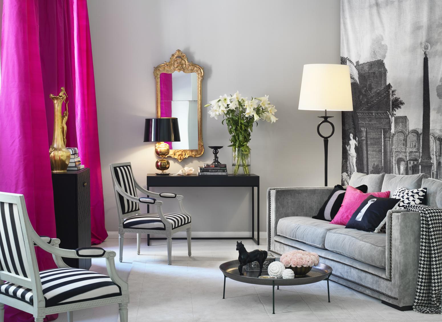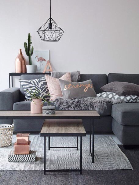 Сочетания серого с различными вариациями розового придает облику интерьера более женственный вид. Такое цветовое сочетание особенно нравится молодым женщинам и девушкам. Неплохо впишутся эти два цвета и в гламурную гостиную, если их разбавить цветочными мотивами.