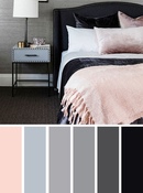 Здесь не рекомендуется применять монохромный серый, а разбавлять его цветными акцентами. Актуален цвет будет для спальни с большими окнами и гладкими одноуровневыми потолками с точечными светильниками, которые поспособствуют заполнению комнаты светом в темное время суток, чем смягчать серость поверхностей. Для пола подбирается ламинат или ковровое покрытие в светлых тонах, для декорирования пространства используются яркие прикроватные коврики, напольные вазы, декоративные подушки, фото в рамках.