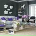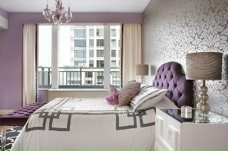 Удачное цветовое решение стен — три серых и одна фиолетовая в качестве акцента. Абажур ярко-сиреневого цвета, фиолетовые шторы позволяют получить современный и при этом по-настоящему уютный интерьер. В эту комнату отлично впишется мебель из натурального дерева. ИЗ цветов для мебельного фасада подойдут белый, черный и серебристый.