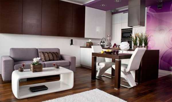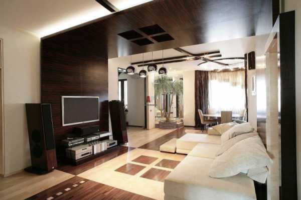 Разграничение большой комнаты по принципу «инь-янь» поможет эффектно зонировать пространство без стен. В малогабаритной квартире лучше ограничиться небольшими элементами кофейно-шоколадной палитры палисандра и светлой обстановкой. Рекомендуется из того же дерева сделать оконные рамы (можно ламинированный пластик), плинтус и межкомнатные двери, как на фото.