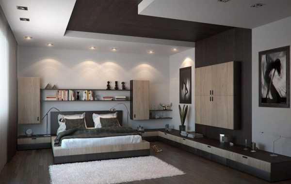 Черный верх, как известно, «нависает». Но палисандр в качестве отделки глянцевых натяжных потолков смотрится благородно, если древесного декора не так много. Желательно комбинировать общее и локальное освещение функциональных зон, чтобы не было неосвещенных участков потолка, как на фото.