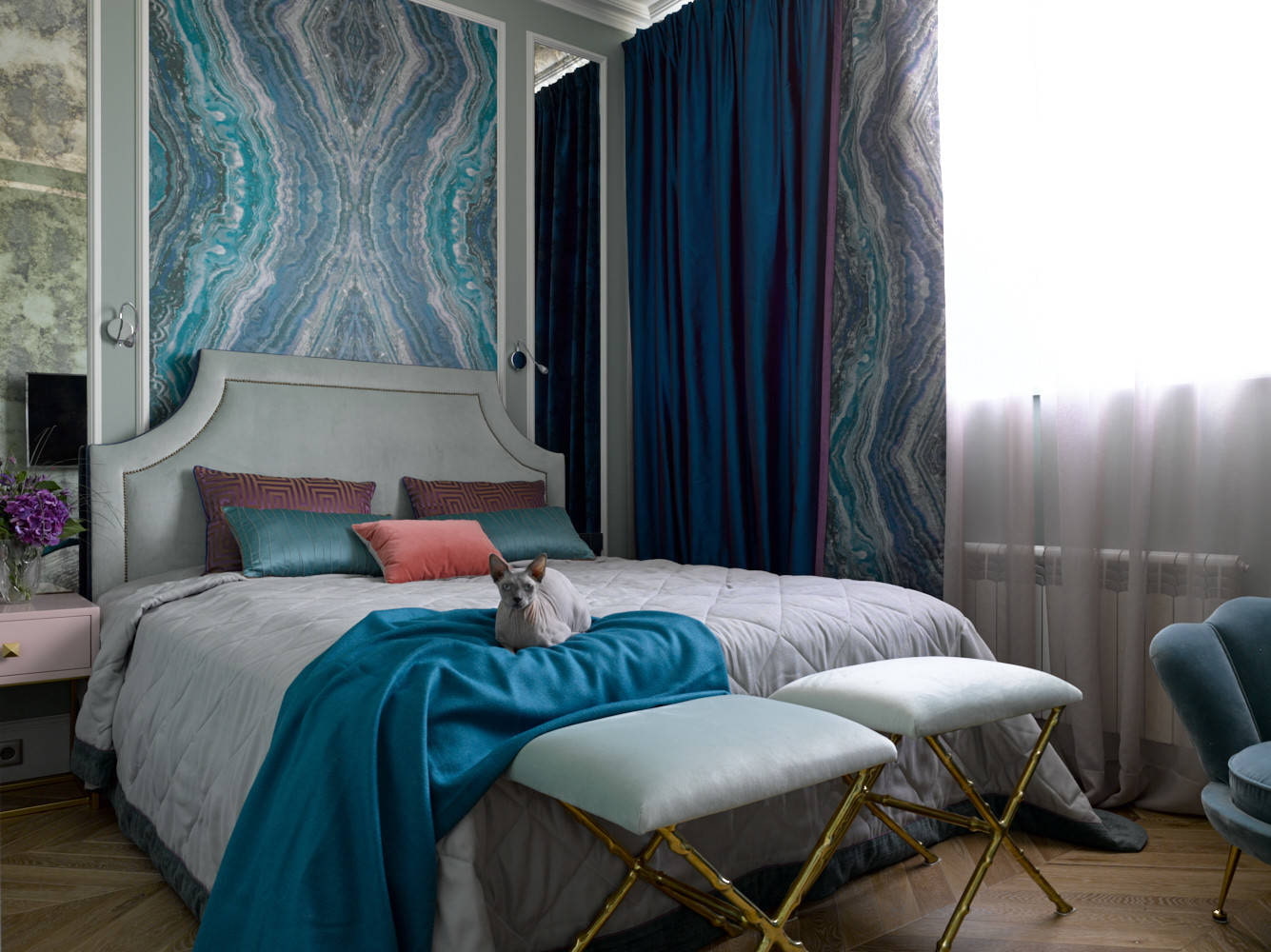 При использовании серых и синих цветов действует правило: если синий цвет должен быть светлым, легким, прохладным.Для яркого синего нужно брать припыленные, приглушенные сероватые оттенки.