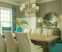 Светлые оттенки бирюзы можно взять за основу, установив в комнате мебель серого цвета с темно-бирюзовыми подушками, накидками. Возможна и обратная комбинация, когда стены выполнены в сероватых тонах, а акценты — бирюзовые, интерьер будет тоже смотреться выигрышно. Подобная смесь цветов хорошо подходит для ванной, гостиной, коридора (в последнем случае все оттенки должны быть светлыми или обильно разбавленными белыми, молочными деталями).