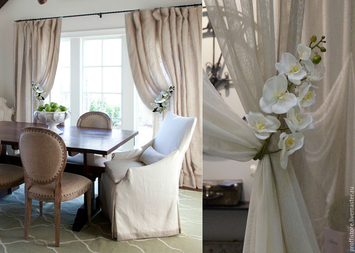 При оформлении шторы цветами следует помнить о том, в каком стиле сделано все помещение. Это позволит создать идеальную законченную композицию.