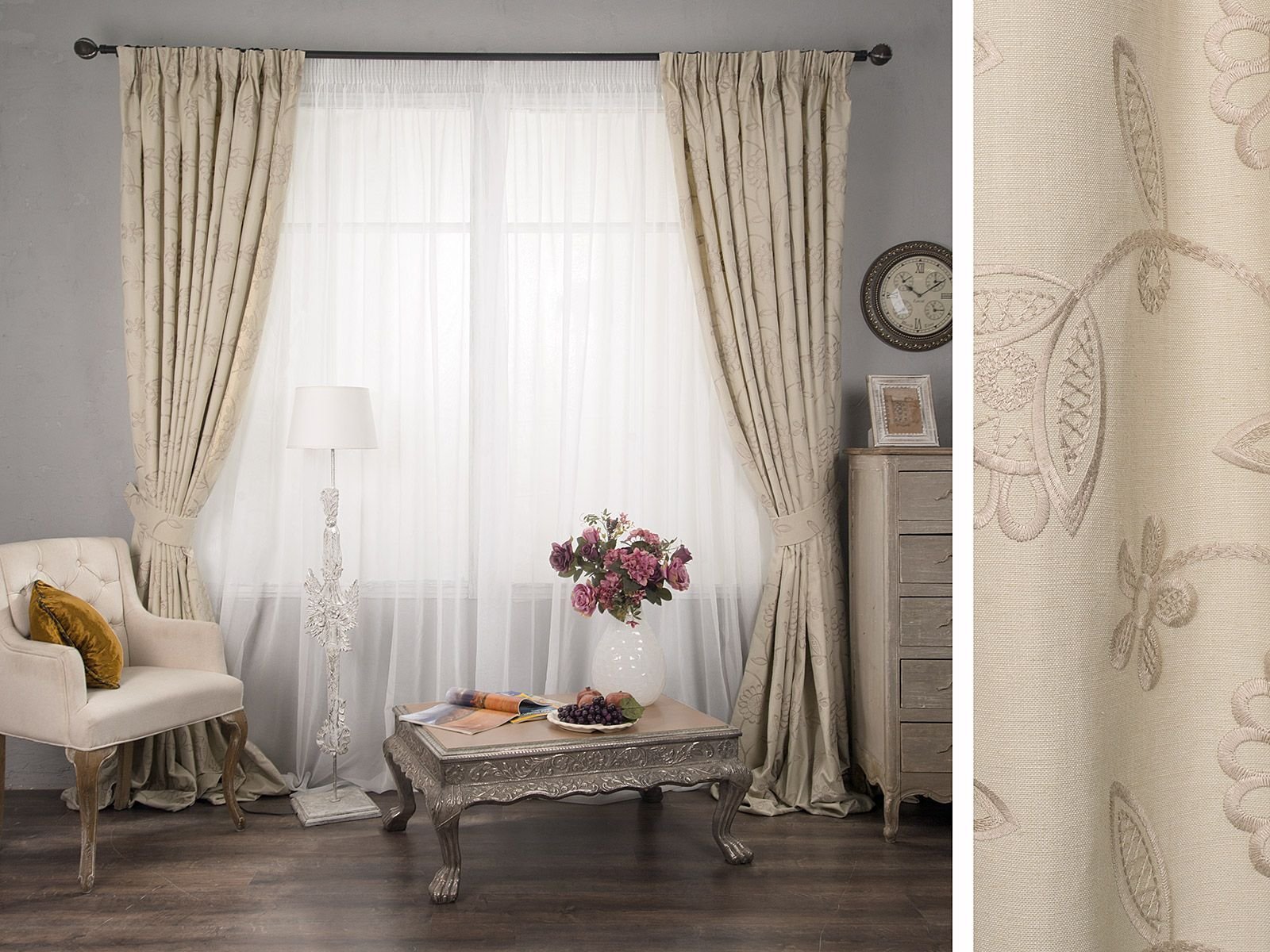Если хозяева негативно относятся к пестрым расцветкам, то шторы могут быть оформлены нейтральными цветочными орнаментами, отличающимися по фактуре, например, вышитыми, напечатанными или прорезанными в ткани.