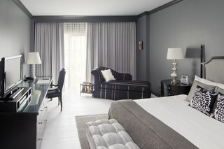 Плотные шторы антрацитового цвета и супер-шикарный диван жемчужно-серого цвета — настоящие звезды. Их благородство кое-где дополняют черные абажуры и металлические предметы искусства. Симметричное расположение мебели способствует каноническому эффекту помещения, а ковер из морских водорослей и прикроватный столик из ствола дерева венчают его очаровательной природой.