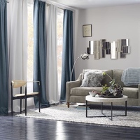 Гостиная, окрашенная в синий цвет, с подходящей мебелью и белыми шторами для гостиной с серым рисунком и черной каймой