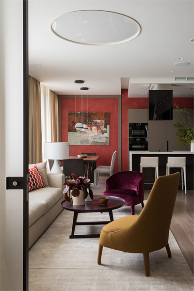 Что касается гостиной, то здесь достаточно внести какой-то крупный элемент данного цвета. Также хорошим вариантом станут детали василькового тона.