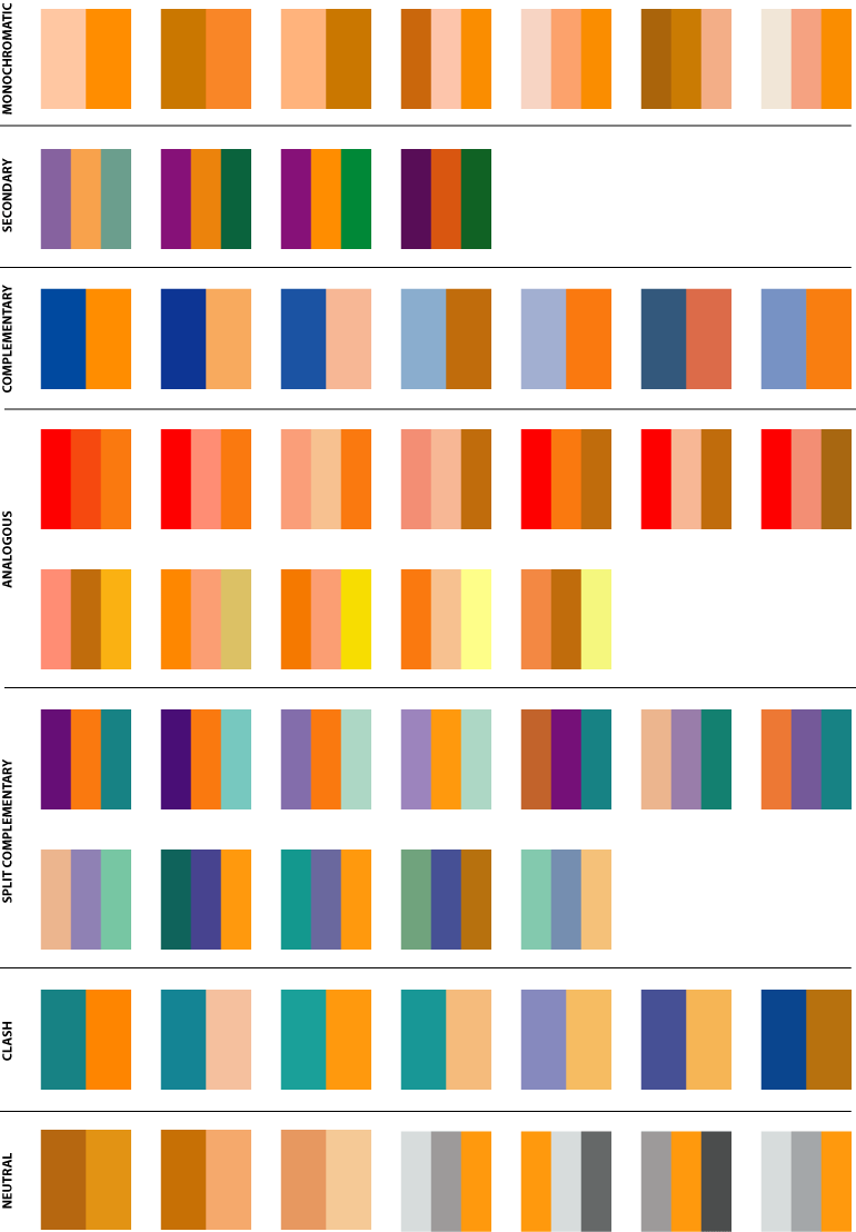 Меньше ошибок будет допущено, если использованы соседние сегменты («сине-фиолетовый – синий», «Оранжевый – красно-оранжевый»). Чтобы не ошибиться, можно использовать простое правило. Поверните мысленно центральную фигуру на один сегмент по часовой стрелке. Вершины укажут на подходящие оттенки: сине-зеленый, желто-оранжевый и фиолетово-красный.