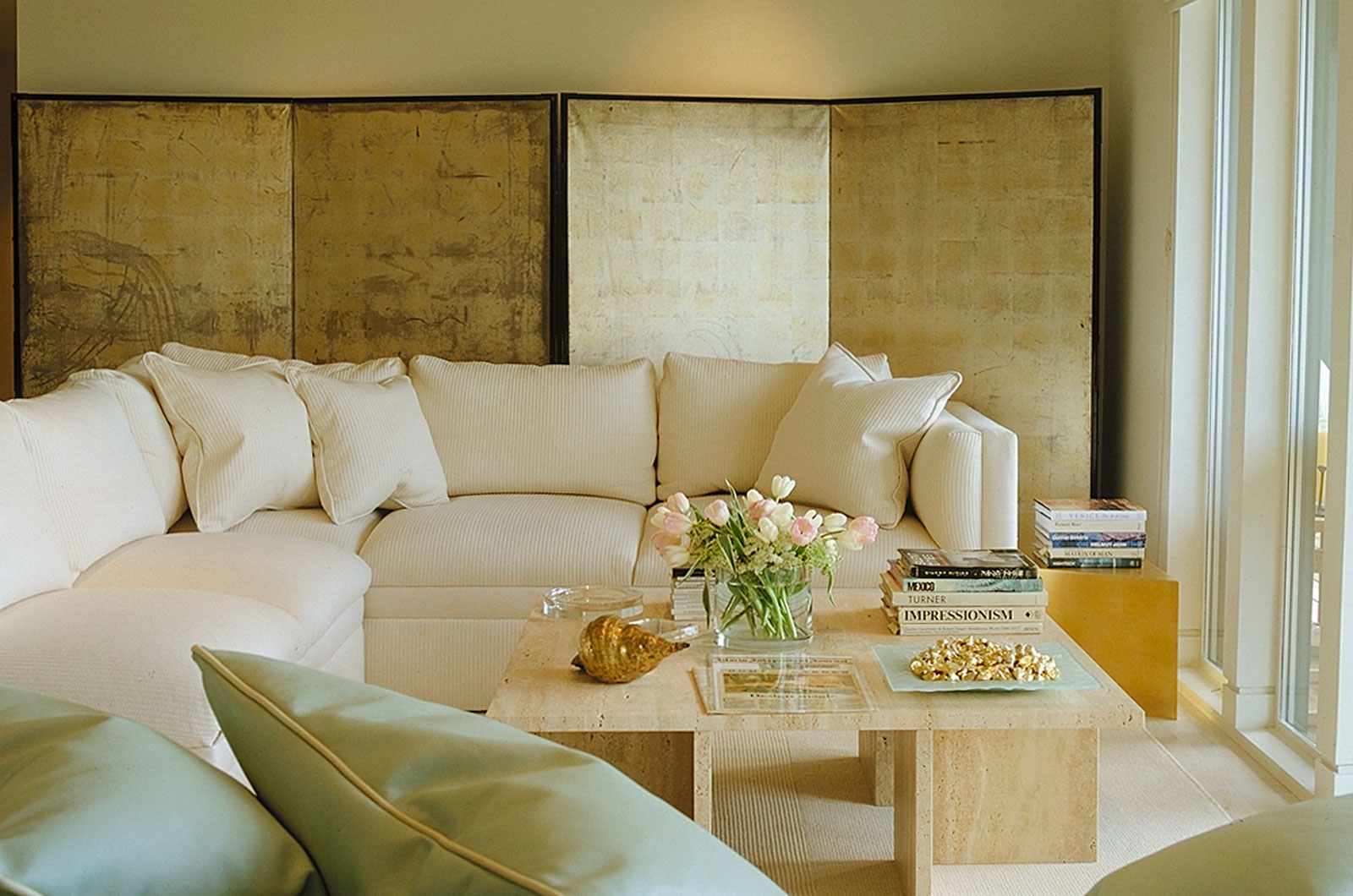 Два природных оттенка часто встречаются в естественной среде, как небо, вода, дерево. Хорошо будет смотреться темная бежевая мебель на фоне бирюзовой стены. Более нежный интерьер получится, если использовать светлые оттенки бежа и бирюзы. В качестве дополнения используют лавандовый, мятный цвета.