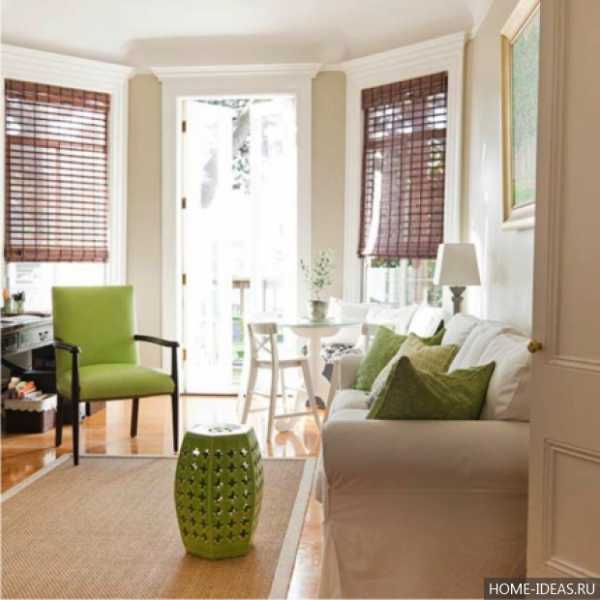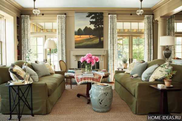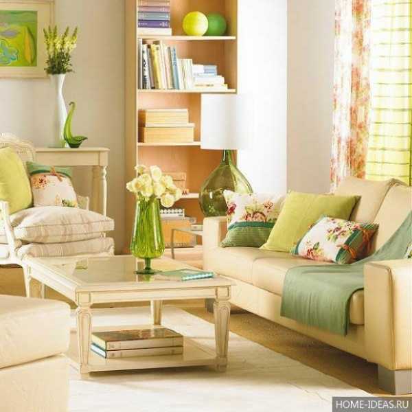 Оливковые тона зеленого добавляют свежести в бежевый интерьер. Красиво смотрятся цветные акценты, например, зеленого цвета шторы, ковер и подушки на диване, когда паркет и стены – светло и темно-бежевые. Такое сочетание цветов открывает большие возможности для декора спальни, гостиной или прихожей.