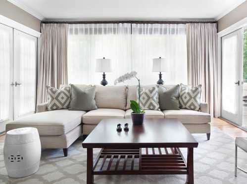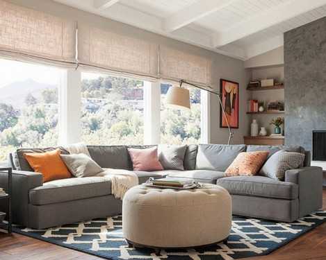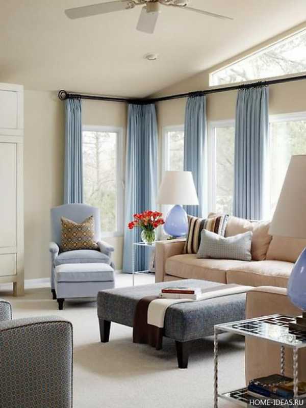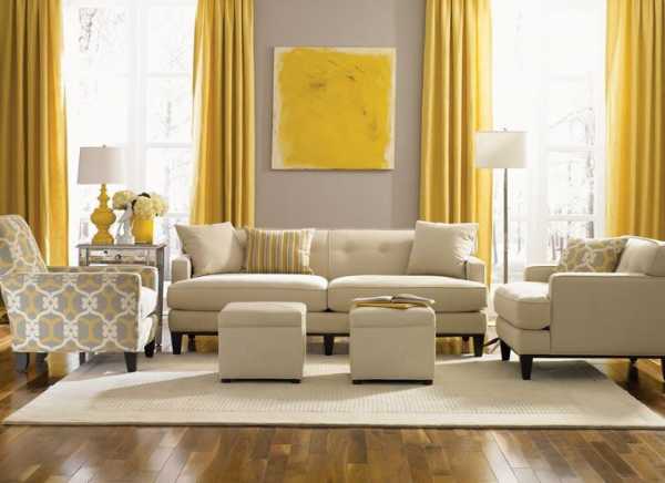 Удачным решением для хмурой серой комнаты станут бежевые занавески с желтоватым или розоватым пигментом — они сделают помещение более теплым и солнечным.