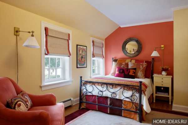 Сочетание бежевого с другими цветами может быть очень «теплым»: достаточно добавить ему в компанию охристый желтый, более глубокий шоколадный или даже вовсе черный. Для спальни оттенки оранжевого считаются слишком активными, но в данном случае приглушенный беж стен прекрасно уравновешивает буйный темперамент яркой терракоты.