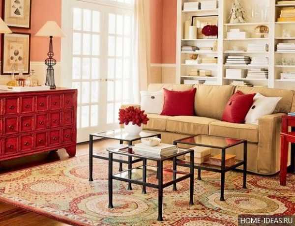С какими цветами сочетается бежевый в интерьере? Посмотрите, как выгодно на фото-примерах прохладный тон серо-бежевого (таупового) оттеняет теплый и согревающий терракотовый. Едва ли можно представить на его месте нечто более гармоничное. Даже сочный алый цвет не выглядит в интерьере гостиной слишком броским, скорее — вишенкой на торте «крем-брюле.