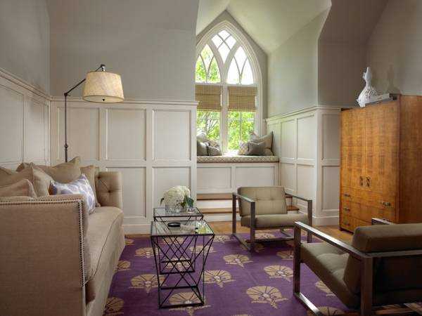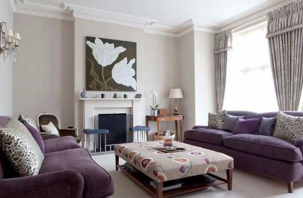 Акценты на фиолетовых деталях: абажуры, принты на мебели, ковры, вазы, отдельные тумбочки или столики и т.д.