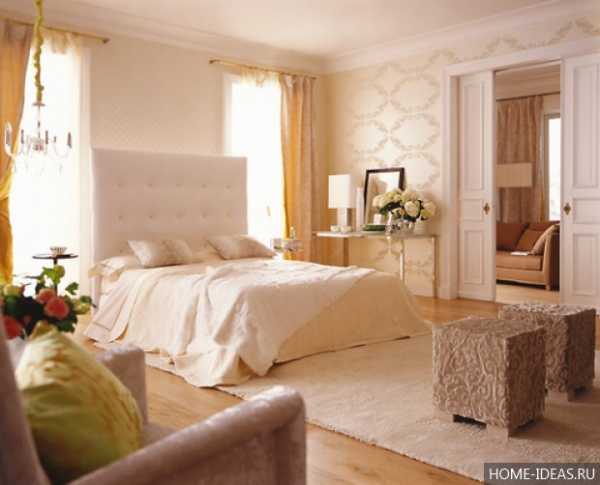 Чтобы спальня не превратилась в безликое бежевое пятно можно использовать несколько оттенков бежа, при этом ввести разные материалы, фактуры, текстуры, узоры. Так стены, пол, мебель и текстиль не будут сливаться друг с другом. Близкие по цвету, они должны быть разные «на ощупь». Например, диван может быть бархатистым, а плед — пушистым.