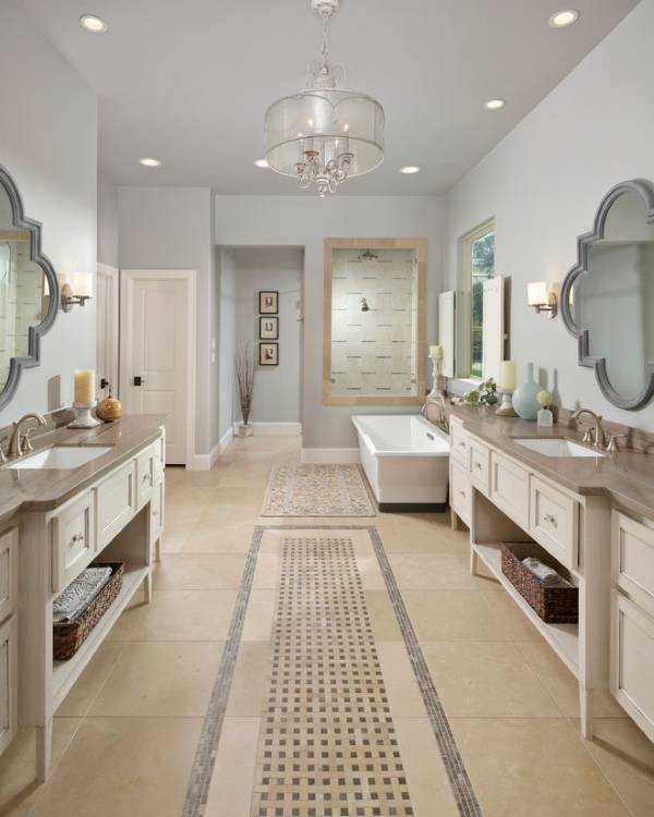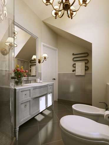 Для оформления ванной комнаты используют сочетание бежевого с золотисто-розовыми тонами. Это позволяет зрительно увеличить помещение и добавить королевского лоска в оформлении.
