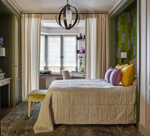 - Бежевый и оливковый цвета хорошо подходят до спальни, так как их спокойствие и релаксация — то что нужно для этого самого тихого помещения квартиры.