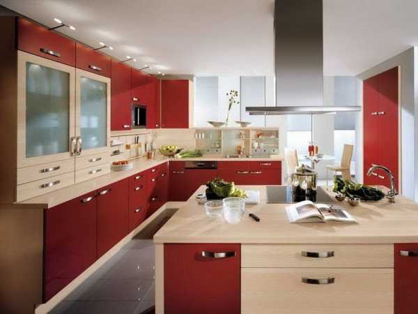 Бордовая и красная кухонная мебель или же нижние фасады — это современный стиль и ретро. В первом случае используется глянец и фактурная отделка бежевых стен. В ретро дизайн может быть ажурным, а гарнитур – матовым, с использованием классического декора (молдинги, фрезеровка, узоры). Ажурными могут быть обои, шторы, обеденный комплект.