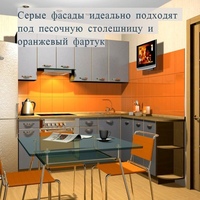 Светлые стены и потолок сделают палитру более мягкой и приятной для глаз. Бытовую технику для такой кухни оптимальнее подбирать цвета металлика. Кухонный фартук дополняется ярким, красивым изображением. Пол лучше сделать из керамогранита или ламината в сером или светло-коричневом цветовом решении. Внести живую нотку свежести и бодрости помогут элементы белого цвета.