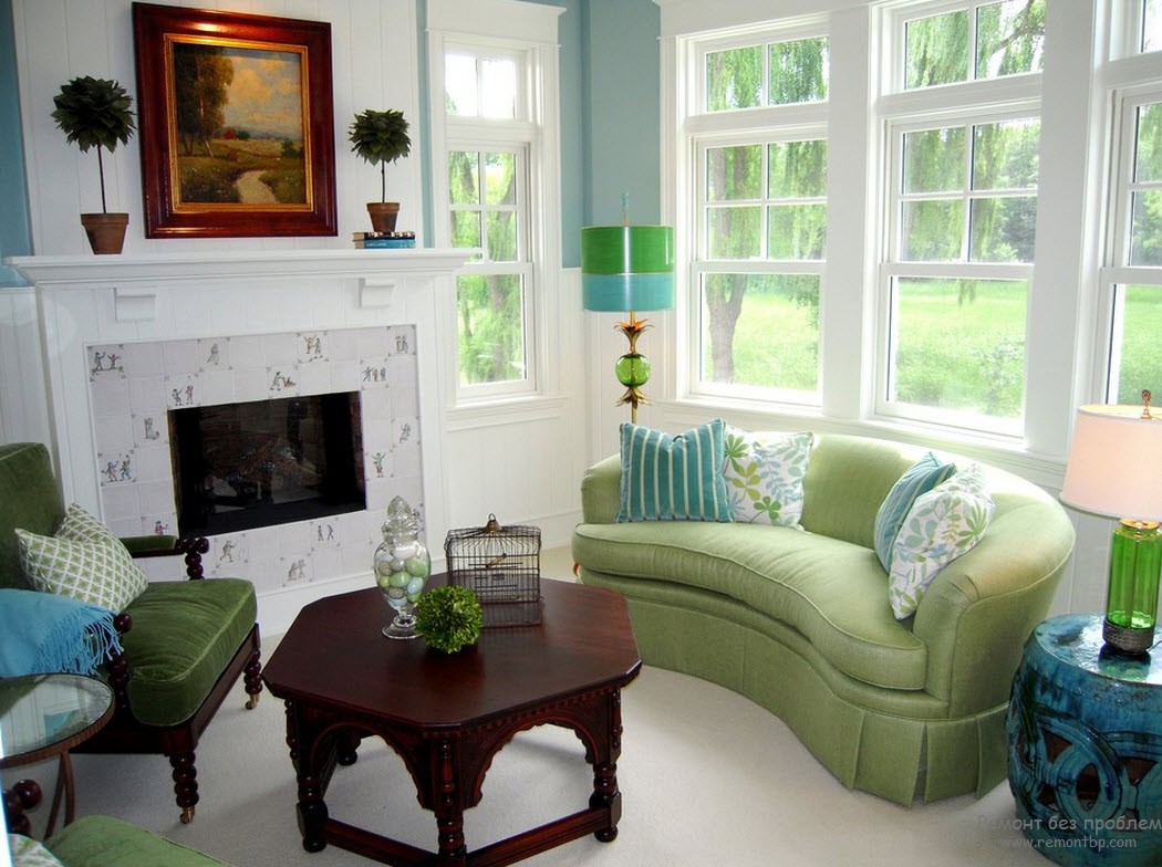 Гостиная с салатовыми стенами гармонично сочетается с мебелью цвета моря. Интерьер такой гостиной можно дополнить оранжевыми аксессуарами. Даже на фото подобные комнаты всегда выглядят по-современному.