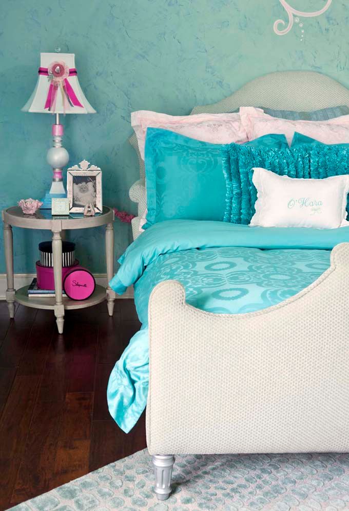 На фото выше – припыленный бирюзово-голубой и такой же томный припыленный темно-розовый из будуарной палитры. Эти элегантные цвета прекрасно сочетаются и между собой, и с красивым оттенком какао (обивка стула). Заметьте, что в этом сочетании нет ничего детского, оно очень изысканно.