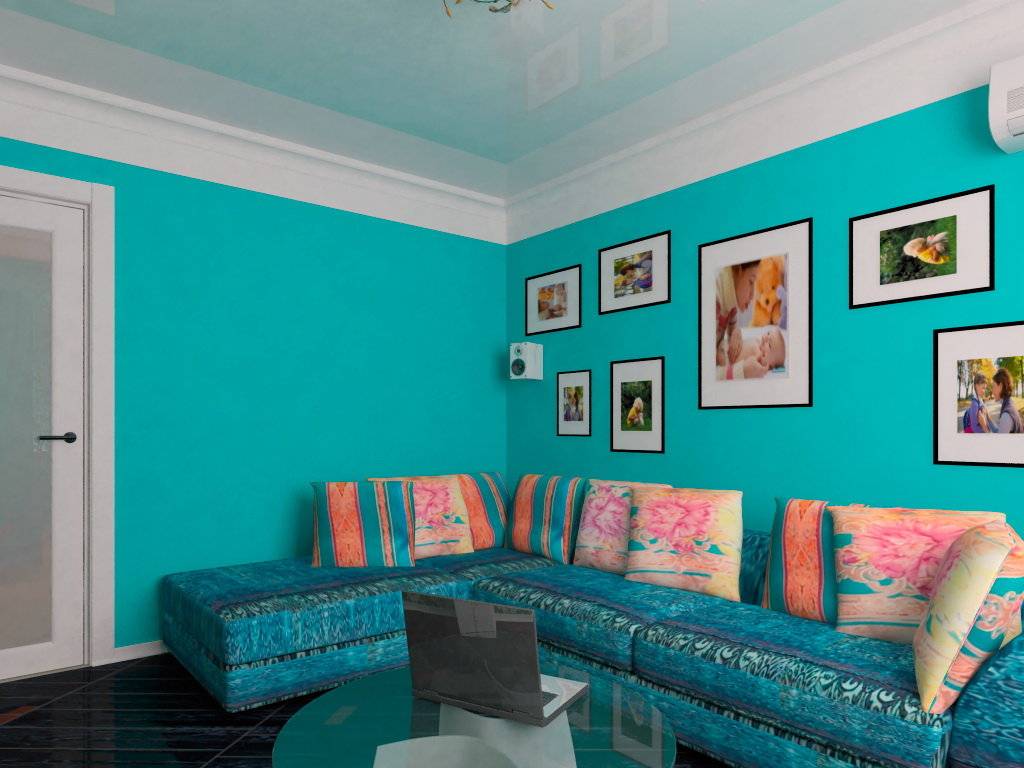 Данный цвет для гостиной будет выглядеть всегда очень модно. Бирюза полностью поможет вам избавиться от стресса и различных приступов агрессии.