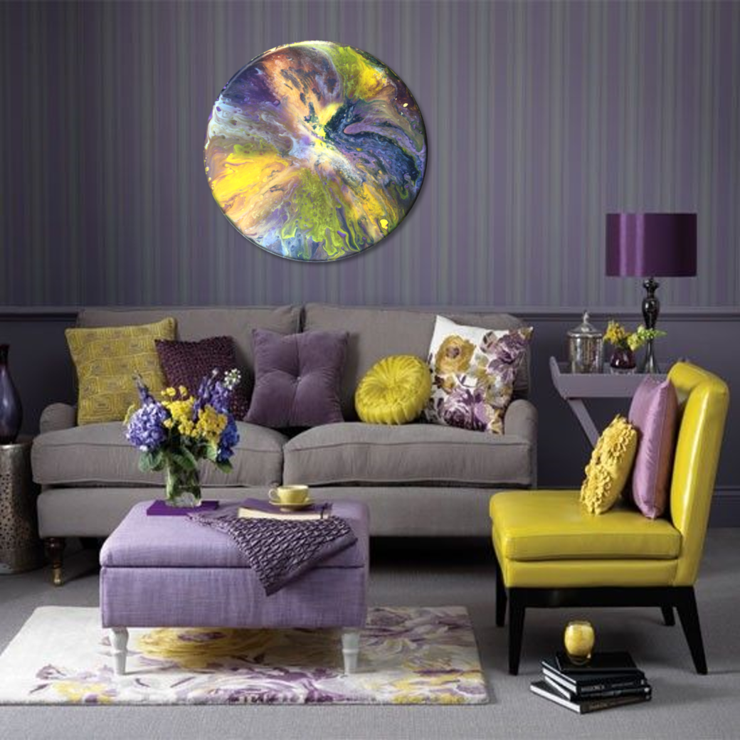 Эта впечатляющая гостиная оформлена на фоне мягкого аметиста, смешанного с серыми и более глубокими сливовыми акцентами. Схема оживает с хитами кислого шартреза для гостиной, полной уверенности.