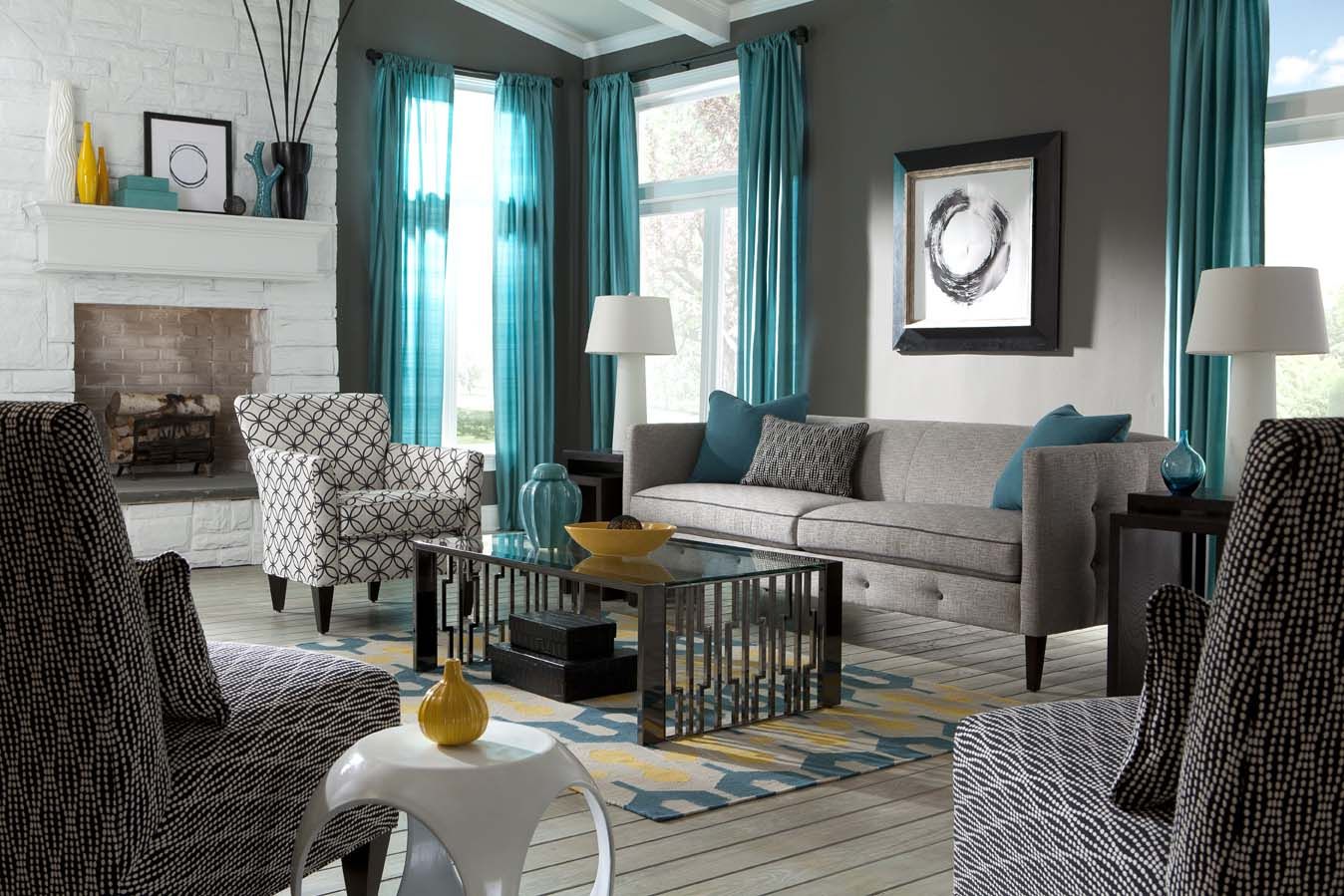 Современный дизайн интерьера, декор и цвета окраски, бирюзовая, темно-синяя, светло-зеленая и серая цветовая гамма для украшения дома Современный дизайн и декор гостиной в бирюзовых, насыщенно-голубых и светло-серых тонах, подчеркнутых коричневой деревянной мебелью и светло-серой краской, автор — Эна Русс