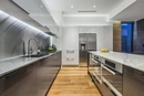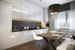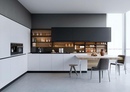 В таком оформлении все подчиняется строгому рационализму: каждый предмет мебели заполняет то пространство, которое для него предназначено, не оставляя никаких зазоров или пустых участков; вся посуда, продукты, утварь и мелкая техника спрятана за элегантными фасадами гарнитура, а крупные приборы (духовой шкаф, индукционная варочная панель, кофе-машина, холодильник) идеально вписываются в единую концепцию высокотехнологичной и ультрафункциональной кухни.
